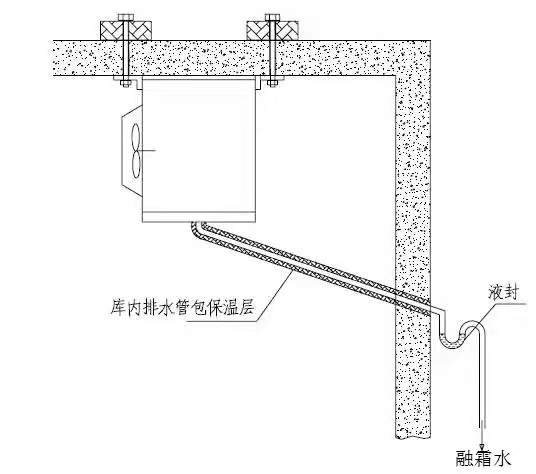 2、冷風(fēng)機的排水管道通往冷庫外應(yīng)有一定的坡度,使融霜水順利地排出庫外;
